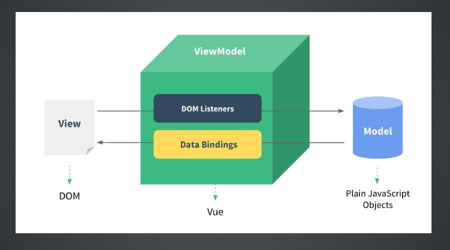 Vue.js主要负责的是上图绿色正方体ViewModel的部分,其在View层(即DOM层)与Model层(即JS逻辑层)之间通过ViewModel绑定了DOM Listeners与Data Bingings两个相当于监听器的东西。