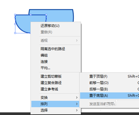 4、右键“排列-置于底层”,将切好的小半圆放置在椭圆下方,并复制一份;