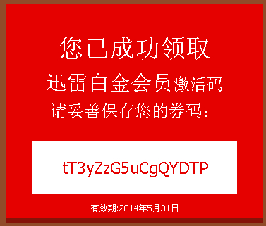 2. 完成后就可以获赠一枚迅雷白金会员的激活码,复制激活码前往兑换处激活开通即可。
