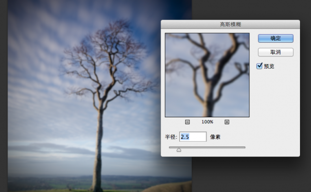 LOMO廉价的塑料镜头清晰度不高,画面非常模糊。复制我们刚刚添加暗角之后的图层,执行菜单项“滤镜>模糊>高斯模糊”,该滤镜能帮助我们模拟LOMO镜头的这种特点。将半径设置为2.5像素,单击确定按钮,再将图层不透明度降至70%。然后我们还可以为照片添加颗粒感,这个要看你的喜好了。