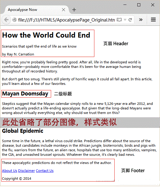 ApocalypsePage_Revised.html中已经将 class 属性为 Header 和 Footer 两个 <div> 替换为 <header> 和 <footer>, 部分代码如下: