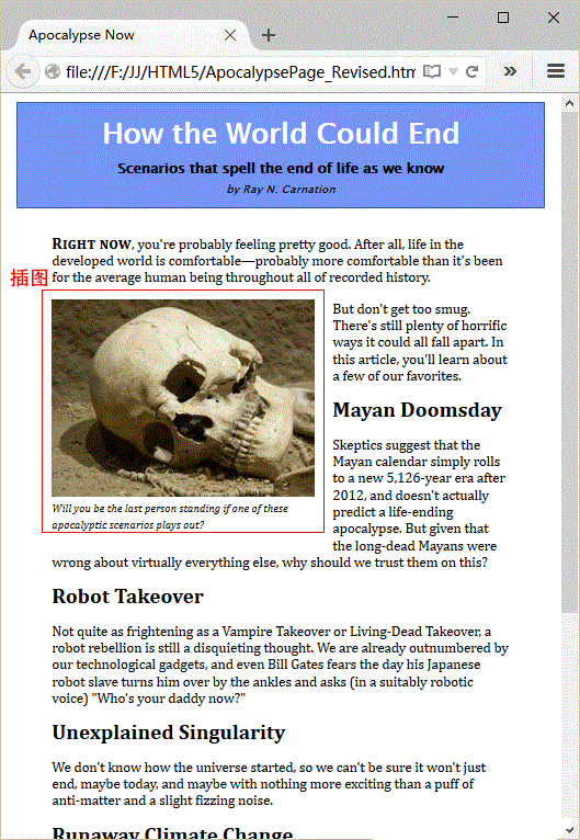 一般来说插图应该是浮动的,还会有浮动图题。下面是在文章中添加插图的 HTML 标记,在正文的第一段和第二段之间的位置,部分代码如下: