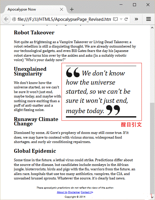 下面的示例中将用作醒目引文(pull quote),使用 <div> 元素可以创造这种效果,但是用 <aside> 元素让标记更有意义: