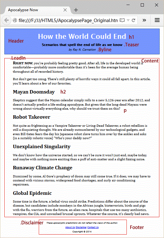 当然,对应的 ApocalypsePage_Revised.css 文件也需要进行修改,将其中的 .Header 和 .Footer 替换为 header 和 footer 。部分代码如下: