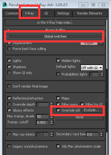 1、打开场景; 快捷键F10将V-Ray选择为当前渲染器;找到“Global switches”,选择一个默认的VRayMtl素材;