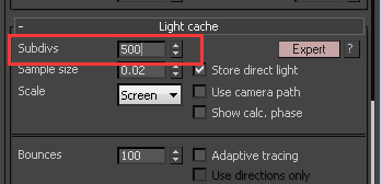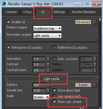 1、打开GI ;选择Light map作为主要和次要GI引擎;在Light cache卷展栏中,将Subdivs设置为500,因为我们只需要快速预览。最终渲染时我们将会把这个返回到默认值1000;