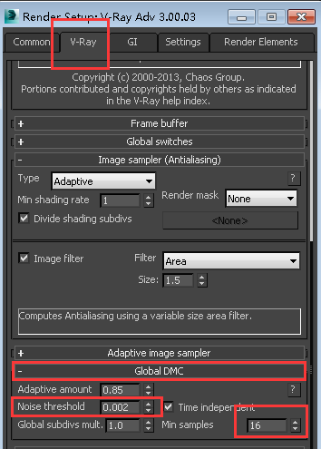 3、现在有抗锯齿,但噪点更明显,我们将调整DMC采样器加以改进:设置“Min samples”为16和“Noise threshold”为0.002,如图: