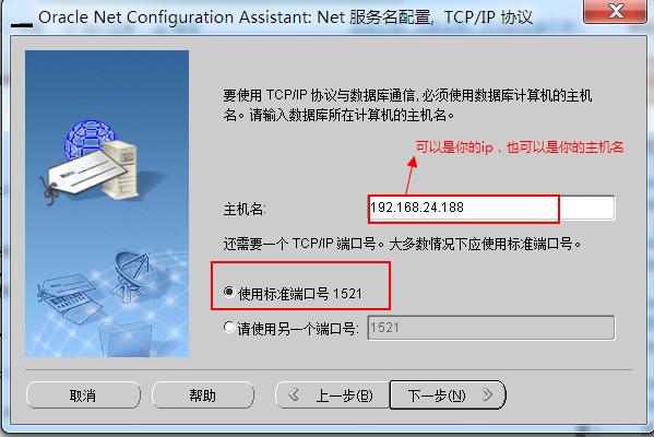 6.填写主机名(可填写你的IP地址,也可填写你的主机名),使用标准端口号1521,下一步