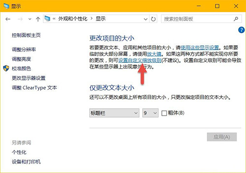 要手动调整 Windwos 10 DPI 缩放比例,可以到「控制面板」-「外观和个性化」-「显示」选项中点击「设置自定义绽放级别」