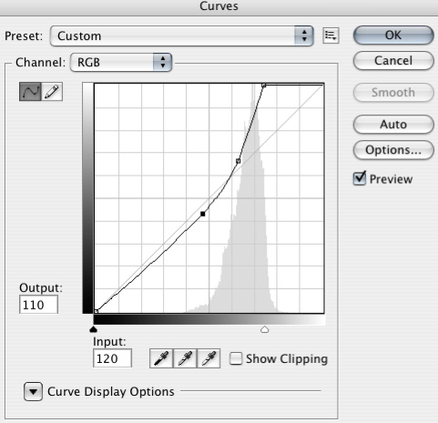 五、在背景图层上方创建一个新的曲线调整图层。我们刚做的选区会自动应用为图层蒙版,将曲线调整为和前面的曲线类似的设置,但是这次我们希望幅度能小一些,使阴影部分不受影响,然后将图层命名为“光源”。