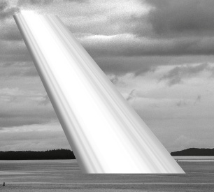 九、关闭“基础光线图层”。选择“光线1”图层。按下Ctrl+T对图层进行自由变换,拖动底部居中的手柄,使其一直伸展至图片中船所在的位置。现在按住Ctrl键同时将相同的手柄向右拖动,使其刚好处于船的下方。按住Ctrl+Shift键,向外拖动左下和右下的手柄直到得到一个让你满意的形状。