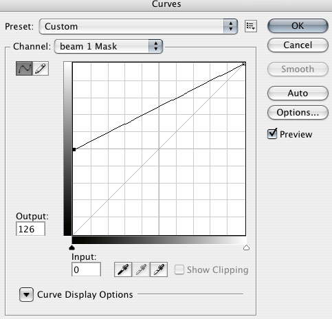 十四、选择“光线1”的图层蒙版,按下Ctrl+M应用曲线。这次将阴影点升高至50%。这样会让光线的中间部分比边缘亮一些。