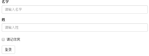 <!DOCTYPE HTML> <html> <head> <link rel="stylesheet" href="/stylesheets/bootstrap.min.css" rel="external nofollow" rel="external nofollow" rel="external nofollow" rel="external nofollow" rel="external nofollow" rel="external nofollow" rel="external nofollow" rel="external nofollow" rel="external nofollow" rel="external nofollow" rel="external nofollow" rel="external nofollow" rel="external nofollow" rel="external nofollow" rel="external nofollow" rel="external nofollow" rel="external nofollow" > </head> <body> <div class="container"> <form class="form-horizontal" role="form"><div class="form-group"> <label for="firstname" class="col-sm-2 control-label">名字</label> <div class="col-sm-10"> <input type="text" class="form-control" id="firstname" placeholder="请输入名字"> </div> </div> <div class="form-group"> <label for="lastname" class="col-sm-2 control-label">姓</label> <div class="col-sm-10"> <input type="text" class="form-control" id="lastname" placeholder="请输入姓"> </div> </div> <div class="form-group"> <div class="col-sm-offset-2 col-sm-10"> <div class="checkbox"> <label> <input type="checkbox"> 请记住我 </label> </div> </div> </div> <div class="form-group"> <div class="col-sm-offset-2 col-sm-10"> <button type="submit" class="btn btn-default">登录</button> </div> </div> </form> </div> </body> </html>
