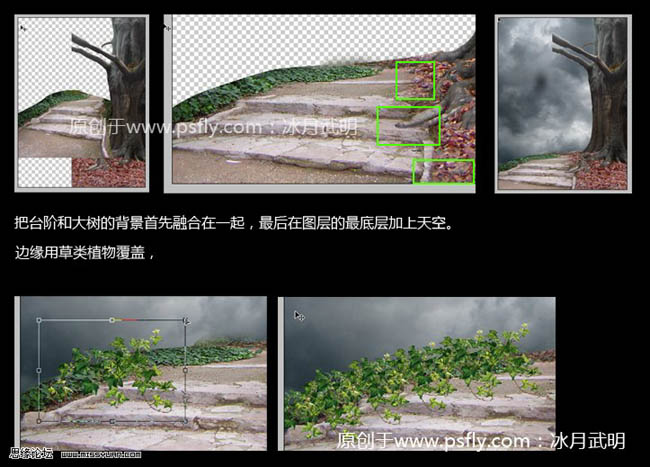 二、打开背景图片及台阶素材,把台阶和大树的别经融合在一起,最后在图层的最底层加上天空,边缘用草类植物覆盖。