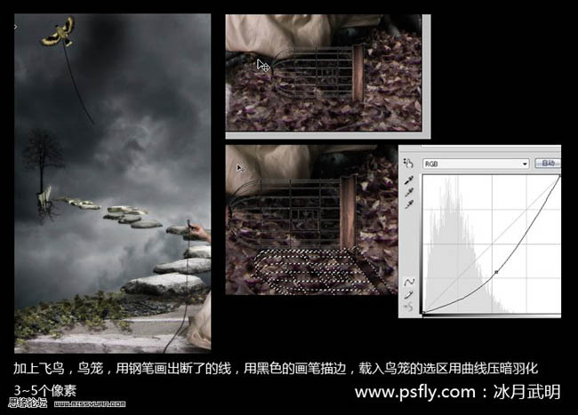 十、加上飞鸟,鸟笼用钢笔画出断了的线,用黑色的画笔描边,载入鸟笼的选区用曲线压暗羽化3-5个像素。