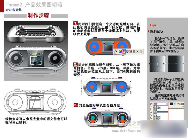 今天的教程将介绍用CDR来绘制一个录音机的方法,主要讲解一下产品明暗关系在CDR中是如何表现的。CCDR最好用的工具个人认为就是渐变,记得一个高手说过:CDR就是拉拉渐变。当然高手对CDR的理解和我们的不一样,高手善于将复杂的事物简单化。好吧,我们看看CDR是否就是'拉拉渐变'。