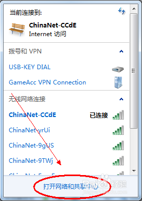 2、在无线连接界面最下方有“打开网络和共享中心”,点击它,打开网络和共享中心界面。
