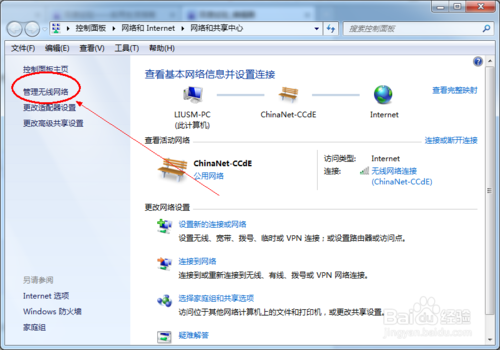 3、点击网络和共享中心界面左侧菜单“管理无线网络”,进入无线网络管理界面。