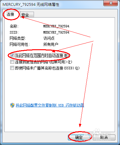 4、右击一个"无线连接",打开属性设置界面,将连接标签下的第一项打上“√”,以后打开电脑后,就会自动连接就近的无线连接,其它无线连接也如此设置。