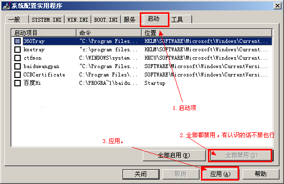 再单击系统配置实用程序中的“启动”选项卡,单击“全部禁用”把所有的启动项都禁用。关闭之后,提示需要重启动才能生效。这时直接重启电脑即可。试试看是否能正常的进入系统?