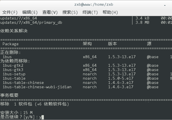 3、登录 root 后,再键入 yum remove ibus,移除现有的输入法框架。