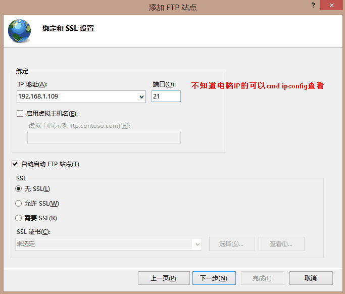 IP设置为本机的IP地址,端口用FTP默认的21,SSL勾选“无”,点击“下一步”,出现“绑定SSH设置”界面。