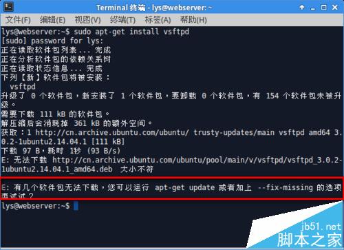 打开"终端窗口",输入"sudo apt-get update"-->回车-->"输入当前登录用户的管理员密码"-->回车,就可以了。如果不运行该命令,直接安装vsftpd,会出现"有几个软件包无法下载,您可以运行apt-get update------"的错误提示,导致无法安装。