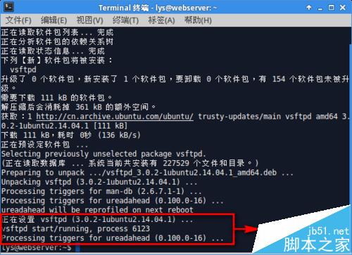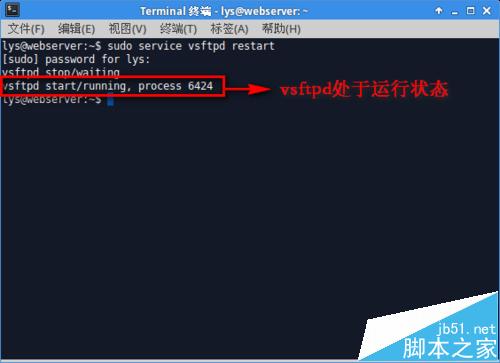 打开"终端窗口",输入"sudo service vsftpd restart"重启vsftpd服务-->回车-->vsftpd处于运行状态,说明安装成功。