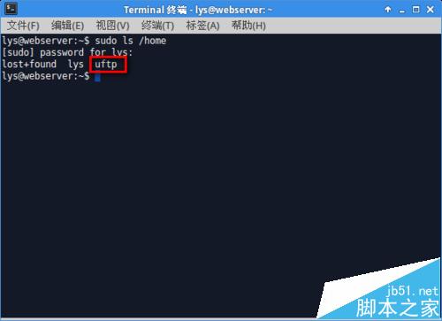 打开"终端窗口",输入"sudo mkdir /home/uftp"-->回车-->输入"sudo ls /home"-->回车-->有一个uftp目录,目录新建成功。
