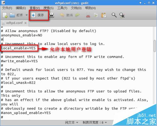 userlist_enable=YES userlist_file=/etc/allowed_users"和"seccomp_sandbox=NO"-->使文件中的"local_enable=YES"-->保存。