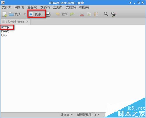 打开"终端窗口",输入"sudo gedit /etc/allowed_users"-->回车-->输入uftp-->保存, 文件创建成功。