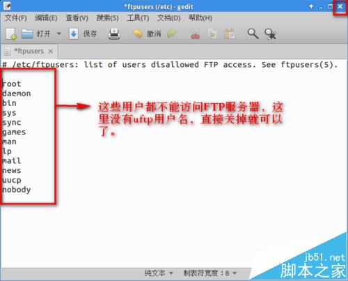 打开"终端窗口",输入"sudo gedit /etc/ftpusers"-->回车-->打开这个文件后,看一看有没有uftp这个用户名,如果没有,就直接退出。如果有就删除uftp,因为这个文件中记录的是不能访问FTP服务器的用户清单。