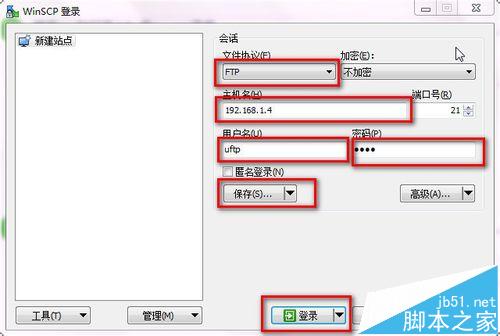 下载安装WinSCP,运行WinSCP-->输入IP、用户名、密码-->保存-->勾选"保存密码"-->确定-->登录-->登录成功。