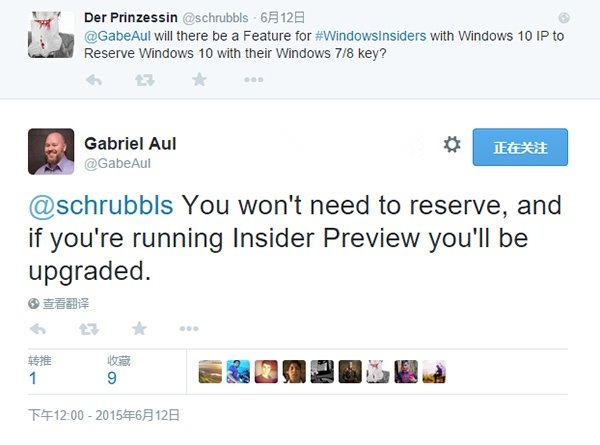 而对于辛勤测试的预览版用户,微软有过推送Win10的说法。为了打消大家的疑虑,Gabriel Aul发推证实,对于使用Windows Insider Preview版本的用户无需进行正式版升级预定,届时会自动升级。