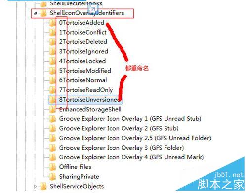 9、原理:Windows Explorer Shell 支持的 Overlay Icon 最多 15 个,Windows 自身使用了 4 个,只剩 11 个可扩展使用,如果你之前还安装诸如 Groove 这样的软件,可能这 11 个位置都被他们剥夺了,轮不到 Tortoise 了。不过,还是可以给 Tortoise 优先腾出位置的:调整 Tortoise 图标名称的字母顺序。因为 Windows 内部就是按图标名称的字母顺序来优先显示的。