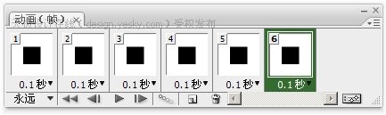 之前我们制作的是位移动画,是利用图层的移动。除此之外,还可以通过设定不同的图层部透明度来产生动画,制作的方法相信大家应该可以猜得到,那就是在不同的帧中改变图层调板中的部透明度数值。现在新建一个100×100的图像,新建一个图层并绘制一个方块。然后一次性复制5个帧出来,将会看到6个帧都是相同的内容。将所有帧的停留时间统一改为0.1秒,如下左图所示。