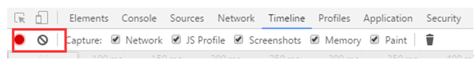 时间表可以记录和运行分析应用程序所有的活动,为了使的记录页面的交互,打开时间轴面板,然后按开始录制录制按钮(),或者通过键入键盘快捷键Cmd的 +E(Mac)或按Ctrl +E(Windows / Linux版)。这个记录按钮会从灰色变成红色,而Timeline将开始从你的页面获取时间线(timeline)。在你的应用中完成一些操作,记录到一些数据之后,再一次点击按钮来停止记录。