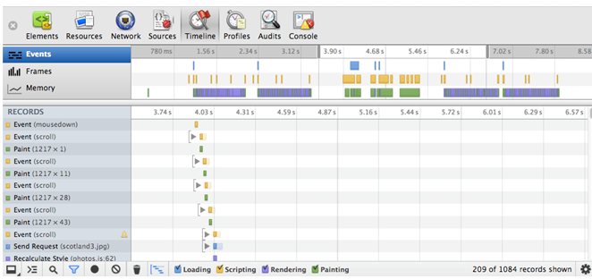 在这个模式中,Summary视图(在Timeline的顶部)显示了一些水平的栅栏,分别代表页面中的网络和HTML解析(蓝色),JavaScript(黄色),样式重计算和布局(紫色)以及绘画和合成(绿色)事件。重绘是浏览器事件,是为响应诸如窗口大小改变或者滚动之类的视觉变化而调用的。
