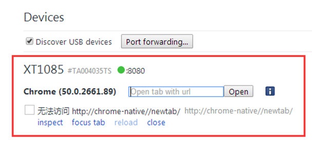 1.3点击 图片中的inspect,即可进入手机页面的调试状态。