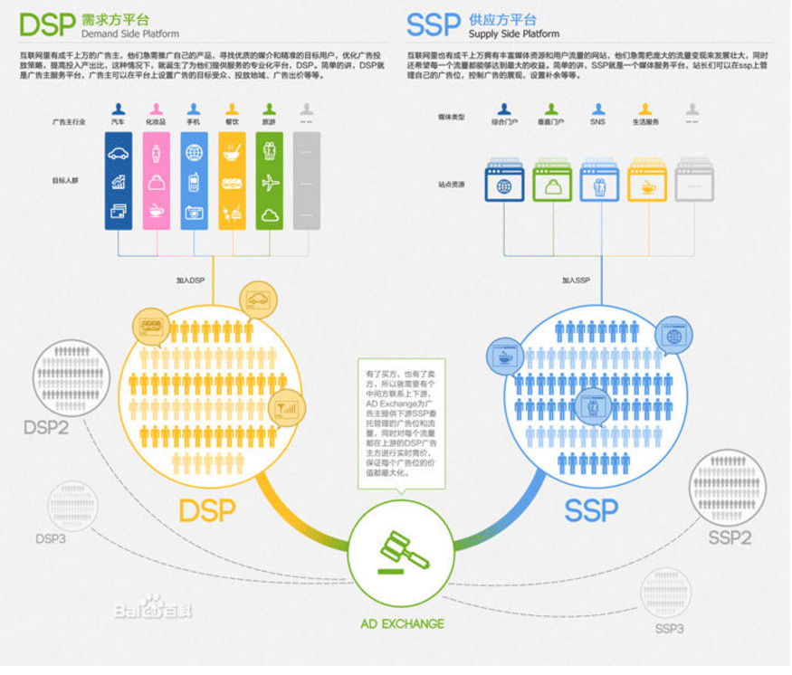 SSP:Sell-Side Platform,媒体服务平台,一般来说链接媒体方/流量方。如百度SSP媒体服务。一般会提供人群划分(一般说的精细化运营的定向投放能力)和收益报表等构成。(下图来源于网络)