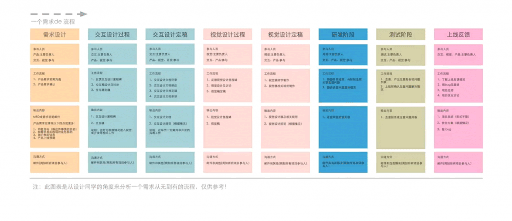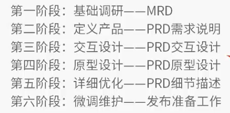 (需求挖掘——需求设计——需求评审——交互设计——视觉设计——评审——研发阶段——测试阶段——上线反馈)