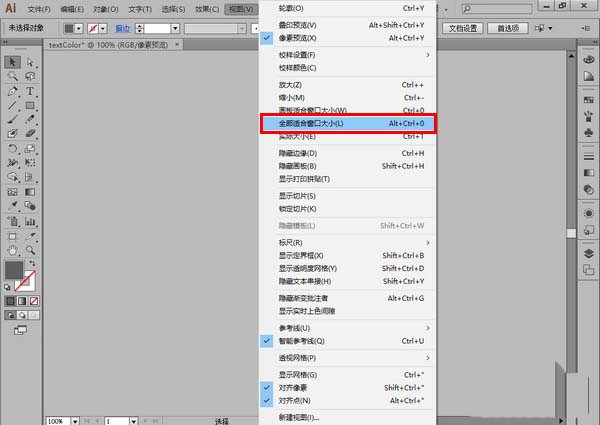 1、首先,如果要操作的图形很小不便操作的话(这在矢量图形中是非常常见的),在 AI 中点击“视图”-“全部适合窗口大小”,将操作窗口放大。