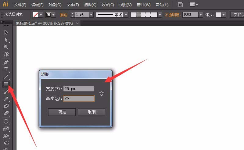 1、使用矩形工具,在画板上点一下,然后会弹出【矩形】窗口,宽度和高度都输入25px,单击【确定】。
