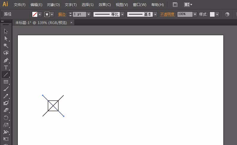 2、使用直线工具,然后鼠标对准小方块的中心点,并且按住Alt+Shift键拖拽到角,会画出45度角的直线。
