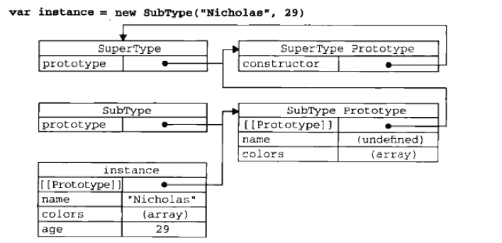 在第一次调用SuperType构造函数时,SubType.prototype会得到两个属性: name和colors; 他们都是SuperType的实例属性,只不过现在位于SubType的原型中。