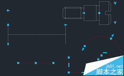 当我们选中一个图形时,图形亮显的同时会显示一些蓝色的点(有的CAD软件夹点是绿色的),这些点就是夹点。在早期版本中这些点只是方形的,在CAD的高版本中又增加了一些其他形式的夹点,例如多段线中点处夹点是长方形的,圆弧两端的夹点是三角性的加一个方形的小框,动态块不同参数和动作的夹点形式也不一样,有方形、三角形、圆形、箭头等各种不同形状。如下图所示。