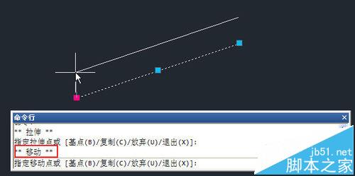 2、默认状态下我们可以通过光标或坐标输入来定位夹点的新位置,也可以用光标确定方向,直接输入拉伸的距离。不同类型的夹点拉伸会产生不同的效果,比如拉伸直线的端点会改变端点位置,拉伸直线中间的夹点会移动直线,拉伸圆弧的圆心夹点是移动圆弧等等。