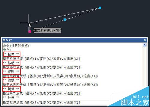 1、对于普通图形夹点,首先可以单击选中夹点后拖动夹点改变夹点的位置,你如果注意看命令行提示就会发现,这种操作在CAD中叫拉伸,和拉伸(stretch)命令差不多,同时CAD还针对这种拉伸操作提供了几个选项,如下所示: