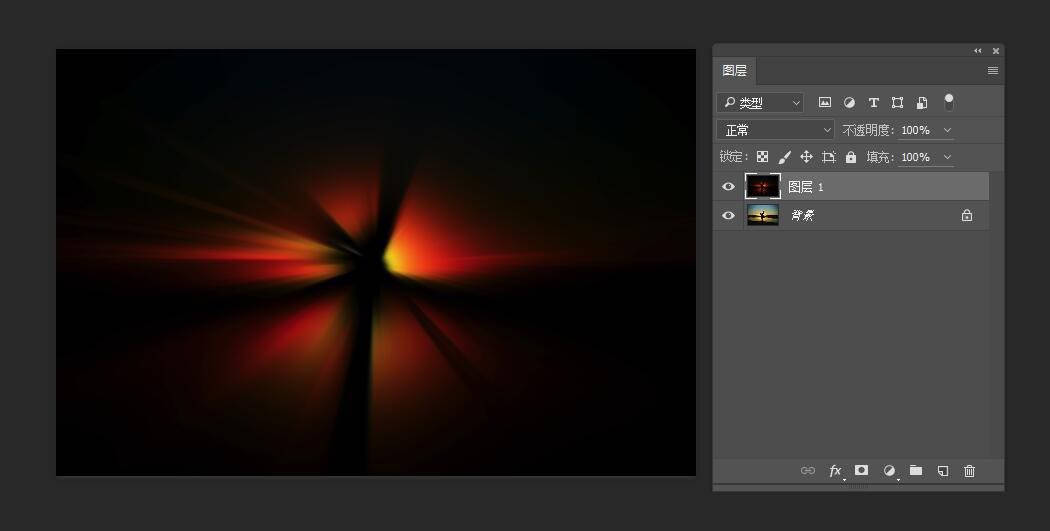 第二步:选择菜单栏的“滤镜”—"模糊"—“径向模糊”,Ctrl+F,重复两次,让光效更柔和。把图层中的“模式”改为“滤色”