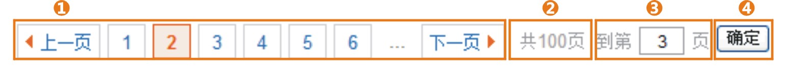 元素:分页的基本元素有:上页+页码+下页(如标注1);总页码(如标注2);跳转页(如标注3);确认"按钮(如标注4);